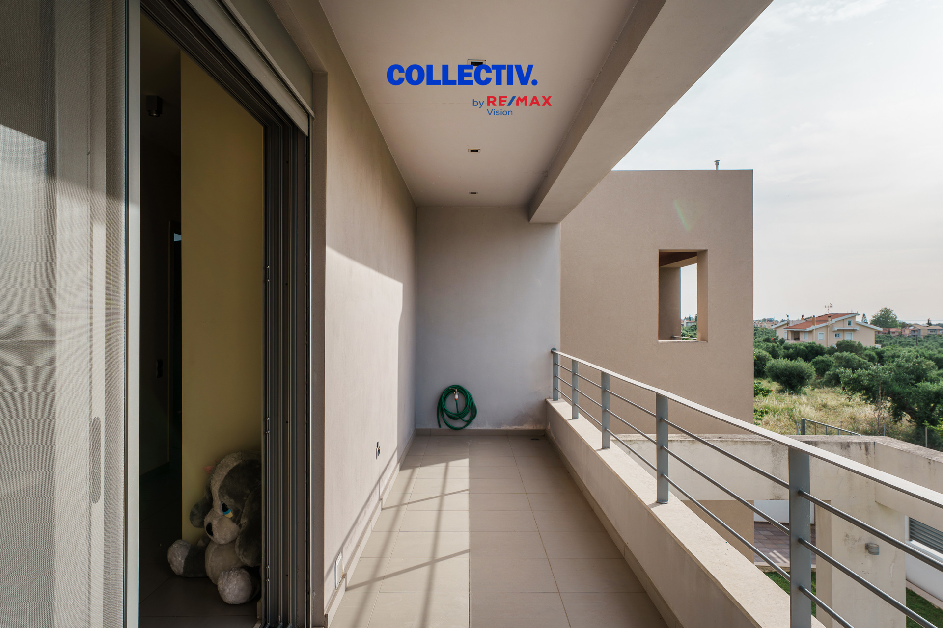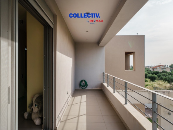Στο ισόγειο, η κατοικία διαθέτει μια λειτουργική κουζίνα, ευρύχωρο καθιστικό με αίθριο, τζάκι και WC, ενώ στο πάνω επίπεδο βρίσκονται τρία υπνοδωμάτια, εκ των οποίων το master bedroom ξεχωρίζει με το δικό του τζάκι και ιδιωτικό μπάνιο. Τα μεγάλα ανοίγματα και το αίθριο επιτρέπουν στο φυσικό φως να πλημμυρίζει κάθε χώρο, δημιουργώντας μια ζεστή και φιλόξενη ατμόσφαιρα.