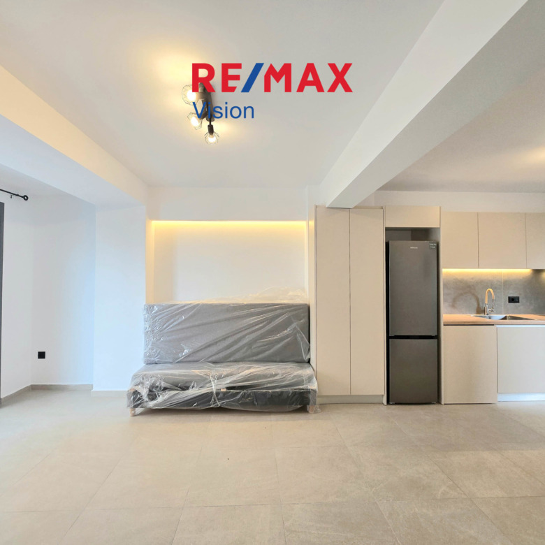 It is freshly painted, front-facing, bright, and dual-aspect, with views of the urban landscape, and a high-end, luxury aesthetic. The apartment is fully furnished and equipped, including a built-in kitchen, refrigerator, washing machine, ceiling light fixtures, a three-seater sofa, a double bed, and a TV unit.