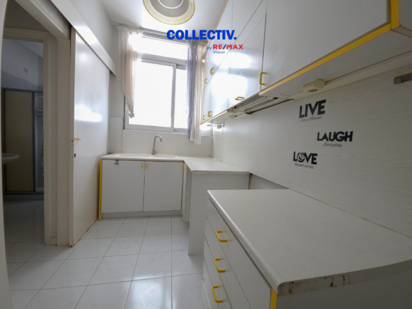 It features aluminum window frames in the living room, kitchen, and bathroom, 3 air-conditioning units, a continuous front balcony, as well as a rear balcony where the bedrooms are located.