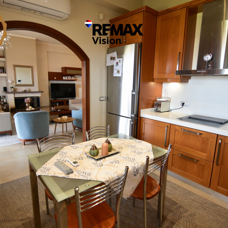 Ο πρώτος όροφος αποτελεί τον βασικό χώρο καθημερινής διαβίωσης και εντυπωσιάζει με το ευρύχωρο και φωτεινό σαλόνι με τζάκι, ιδανικό για στιγμές χαλάρωσης και φιλοξενίας. Η τραπεζαρία συνδέεται αρμονικά με την κουζίνα, δημιουργώντας έναν λειτουργικό και φιλόξενο χώρο.