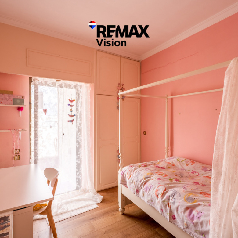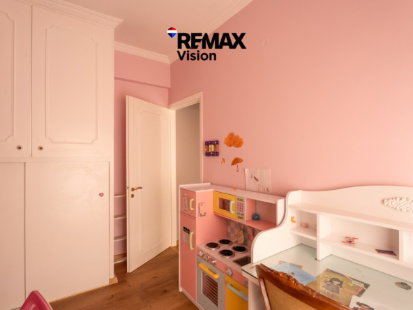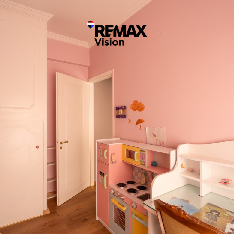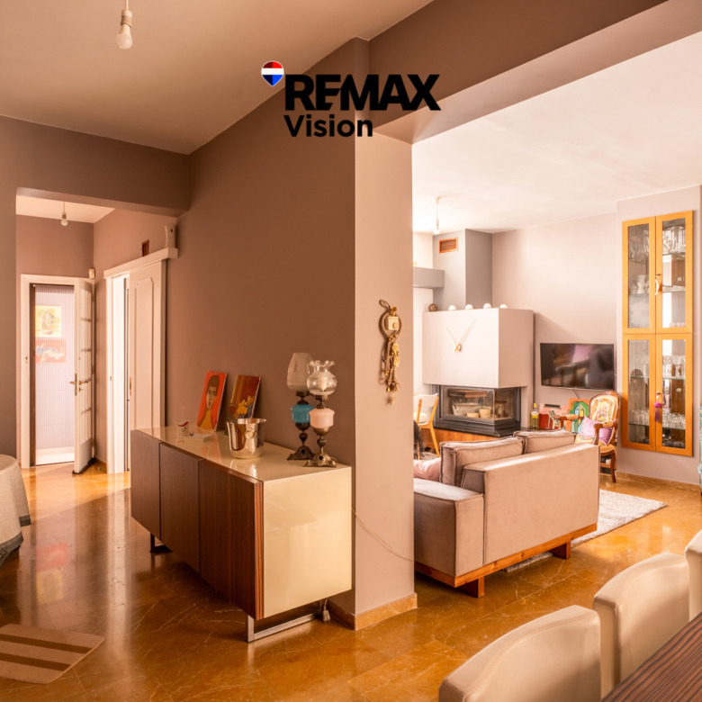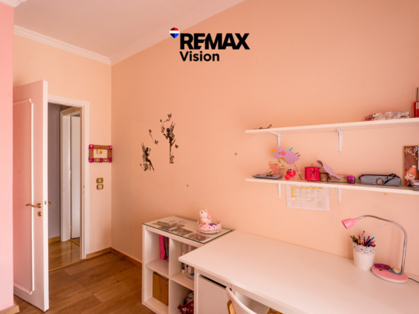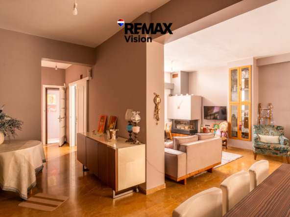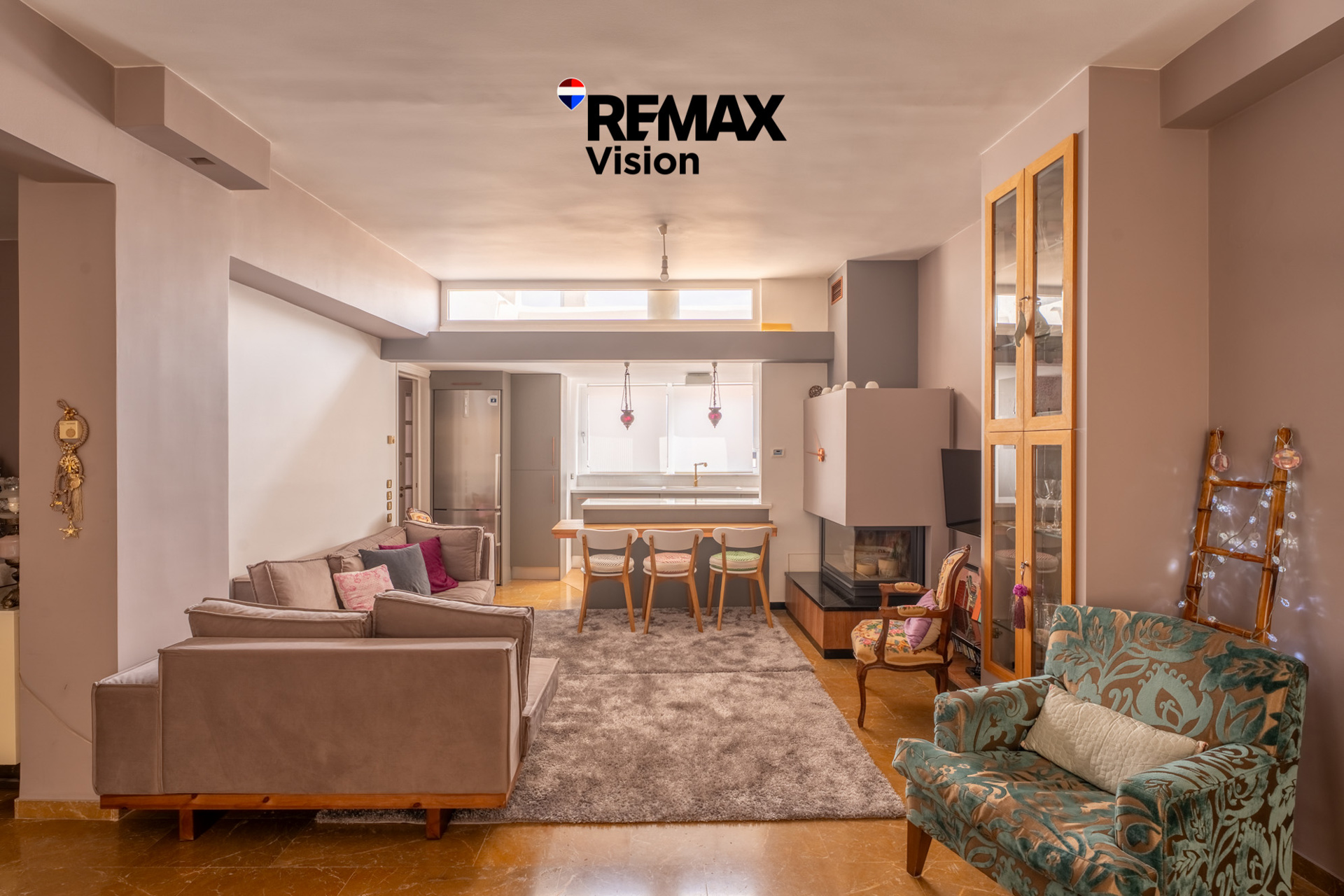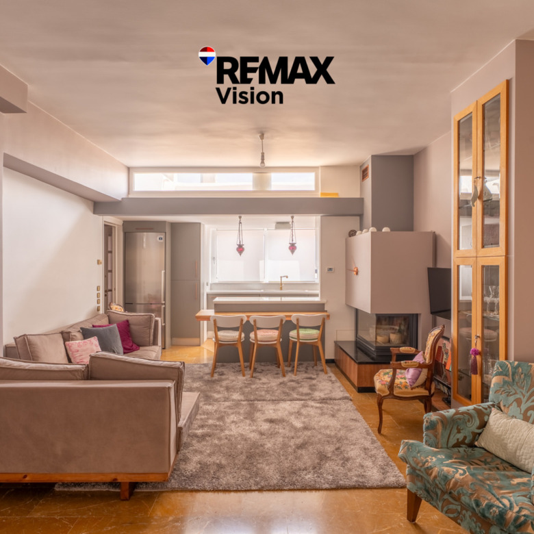 The apartment features 4 bedrooms, a spacious and bright living room with an impressive corner energy-efficient fireplace finished with marble and wood, a fully renovated kitchen, 1 large bathroom with a built-in shower, storage spaces and provision for a washer-dryer, as well as 1 WC with a window. It also includes 2 walk-in closets, a storage room, a small outdoor utility space, and a private indoor parking space.