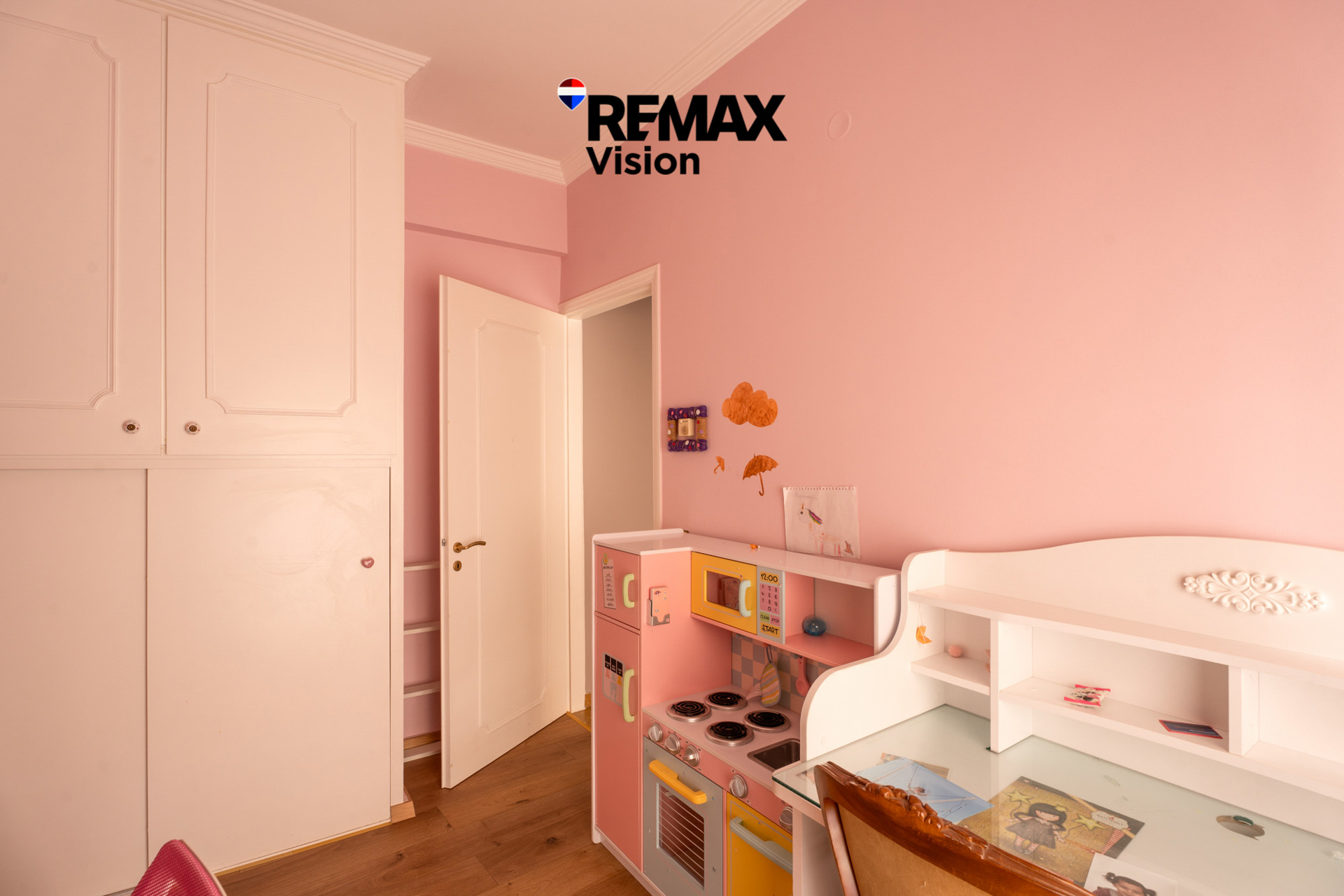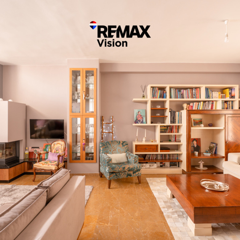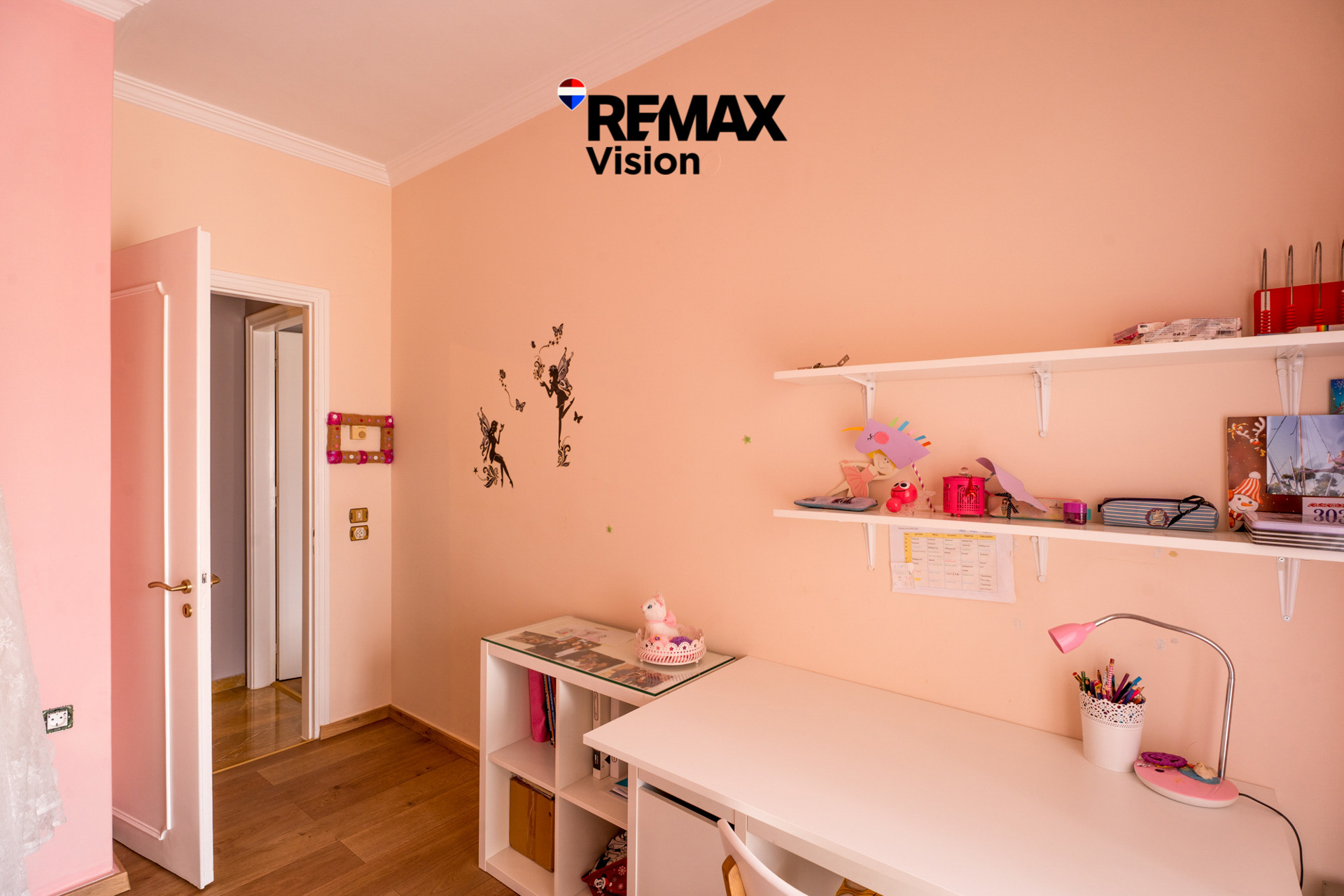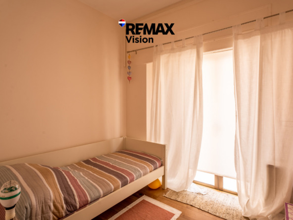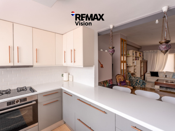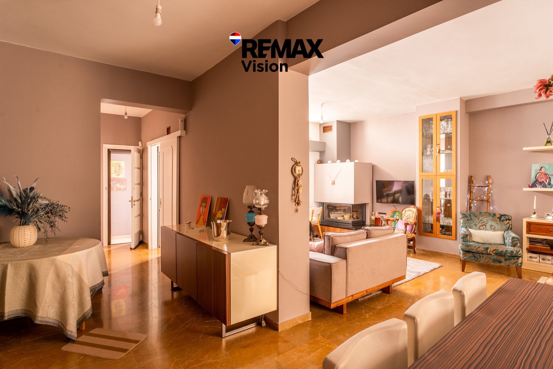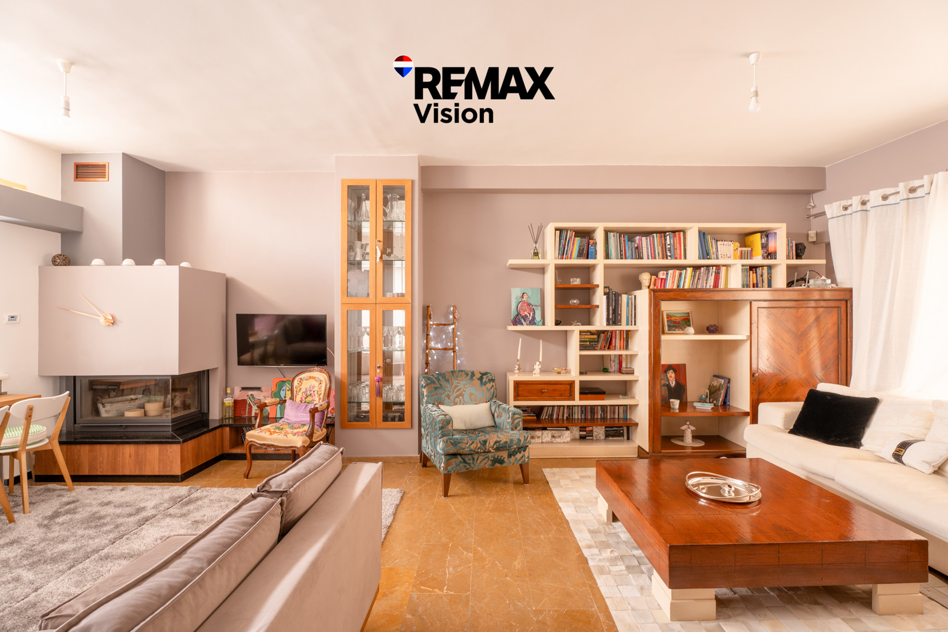 The apartment features 4 bedrooms, a spacious and bright living room with an impressive corner energy-efficient fireplace finished with marble and wood, a fully renovated kitchen, 1 large bathroom with a built-in shower, storage spaces and provision for a washer-dryer, as well as 1 WC with a window. It also includes 2 walk-in closets, a storage room, a small outdoor utility space, and a private indoor parking space.
