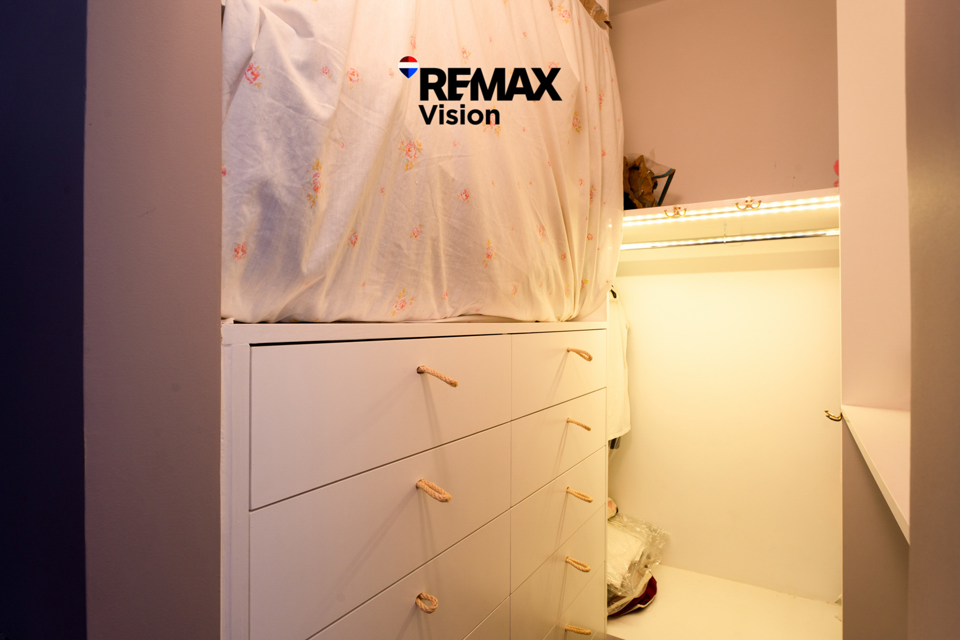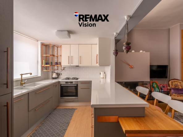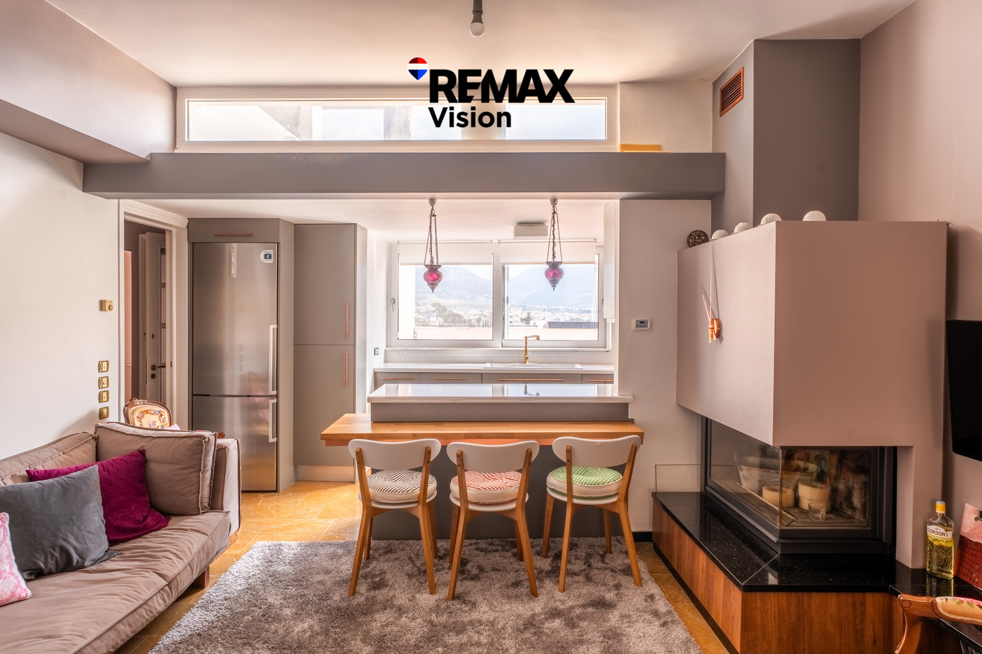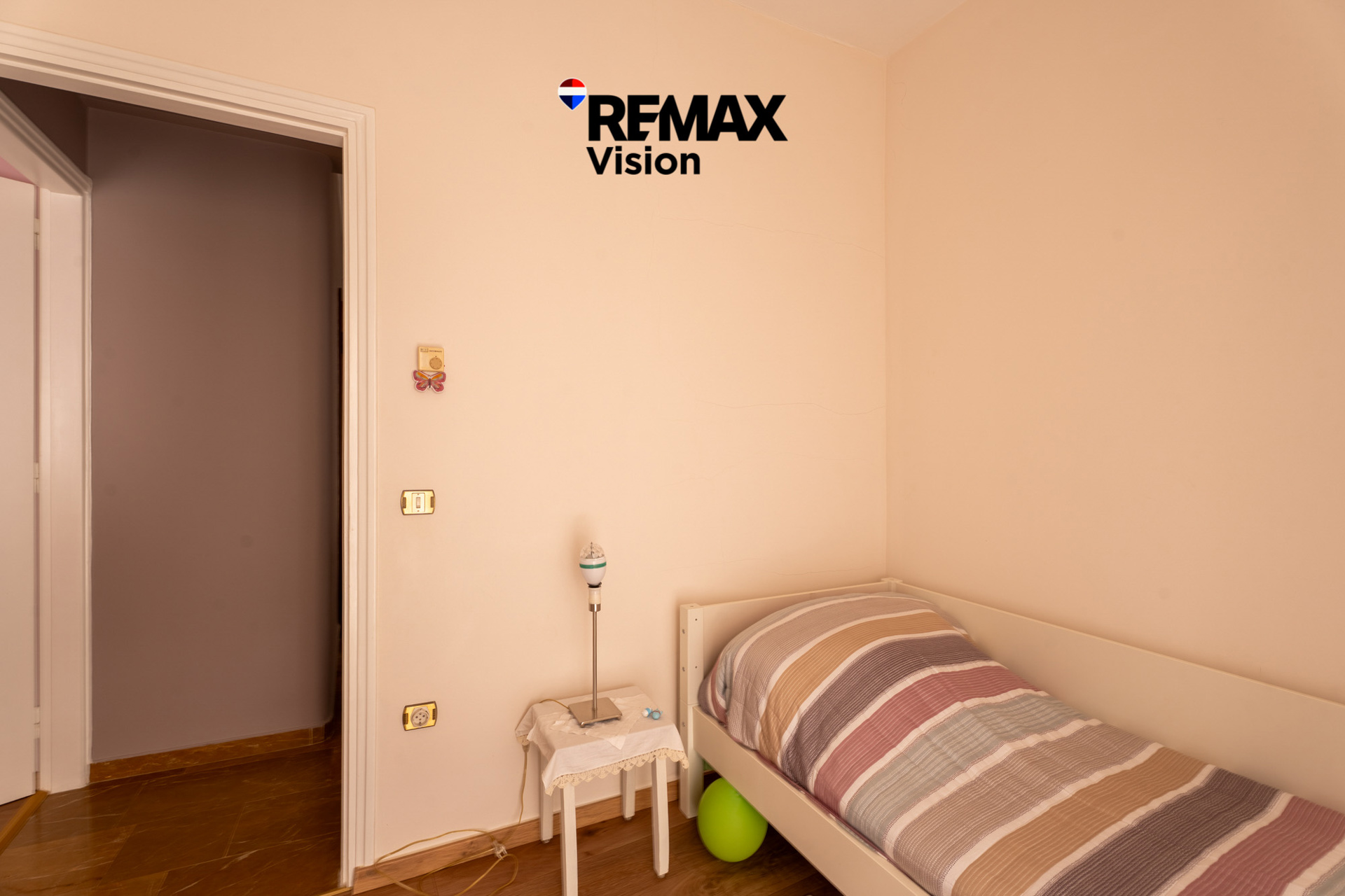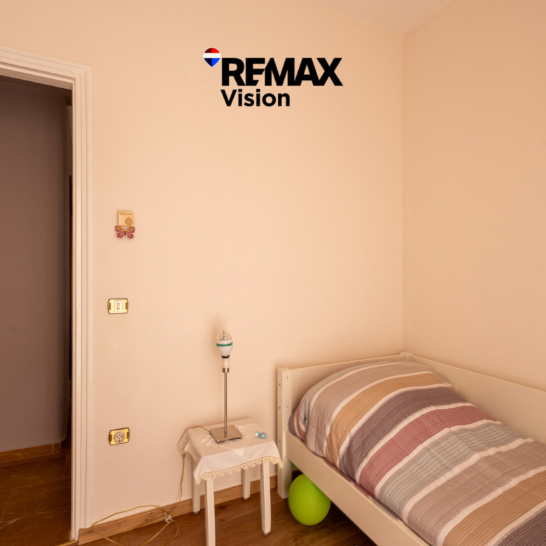 The apartment features 4 bedrooms, a spacious and bright living room with an impressive corner energy-efficient fireplace finished with marble and wood, a fully renovated kitchen, 1 large bathroom with a built-in shower, storage spaces and provision for a washer-dryer, as well as 1 WC with a window. It also includes 2 walk-in closets, a storage room, a small outdoor utility space, and a private indoor parking space.